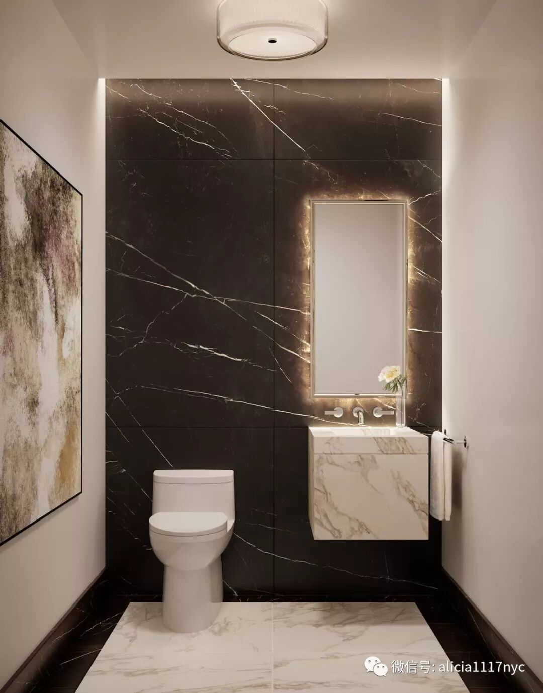 客用洗手间配有醒目的黑白根花纹大理石墙面以及浮雕卡拉考特金色大理石盥洗台。