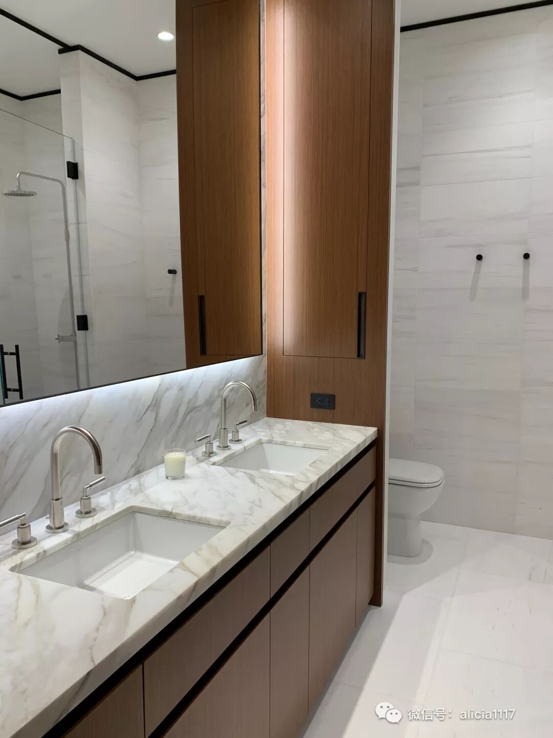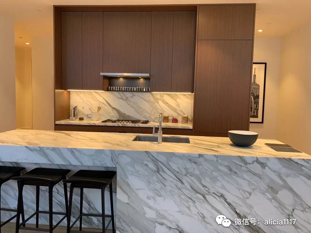 Bianco Dolomiti大理石板搭配温暖深邃的典雅核桃木,以及与厨房相配的Calacatta Borghini浅色大理石,体现了高雅华贵的质感和完整一致性的设计。