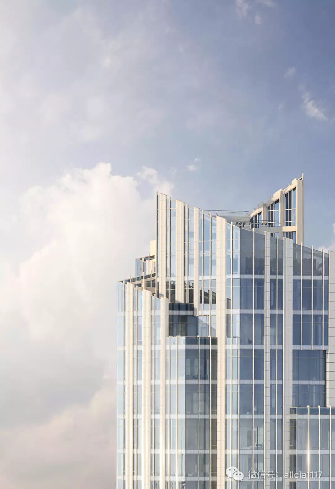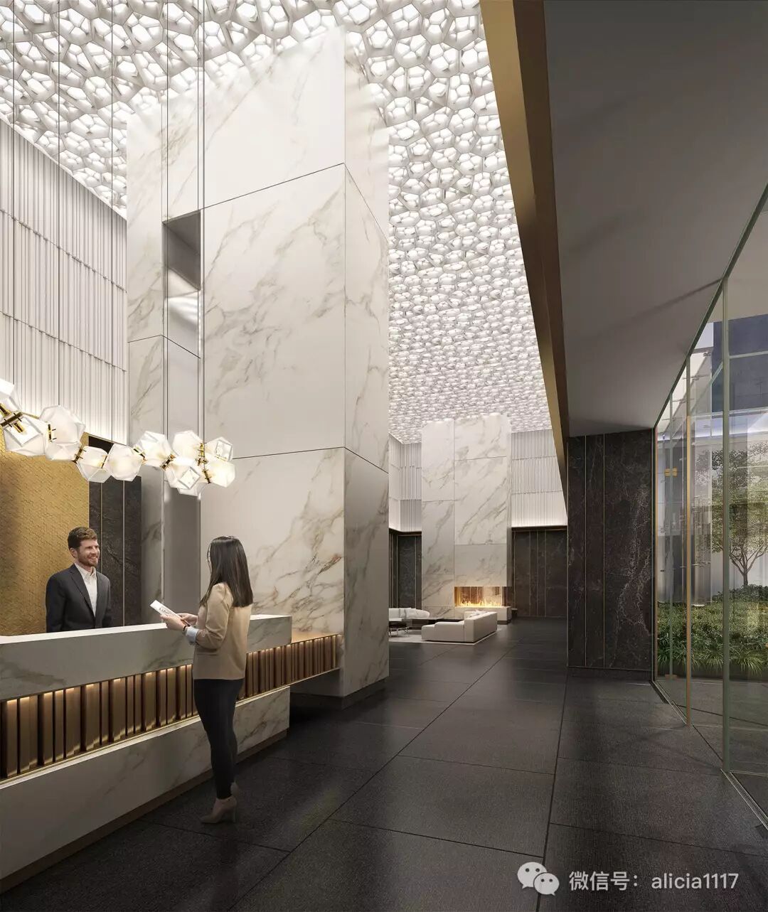 大厅上方的几何雕塑照明,灵感来自于蜻蜓翅膀的纹理,轻盈、优美。从底楼大厅摆设的艺术品到顶层双倍挑高空间的花园露台,这栋建筑的每一处都充斥着精心设计的细节。
