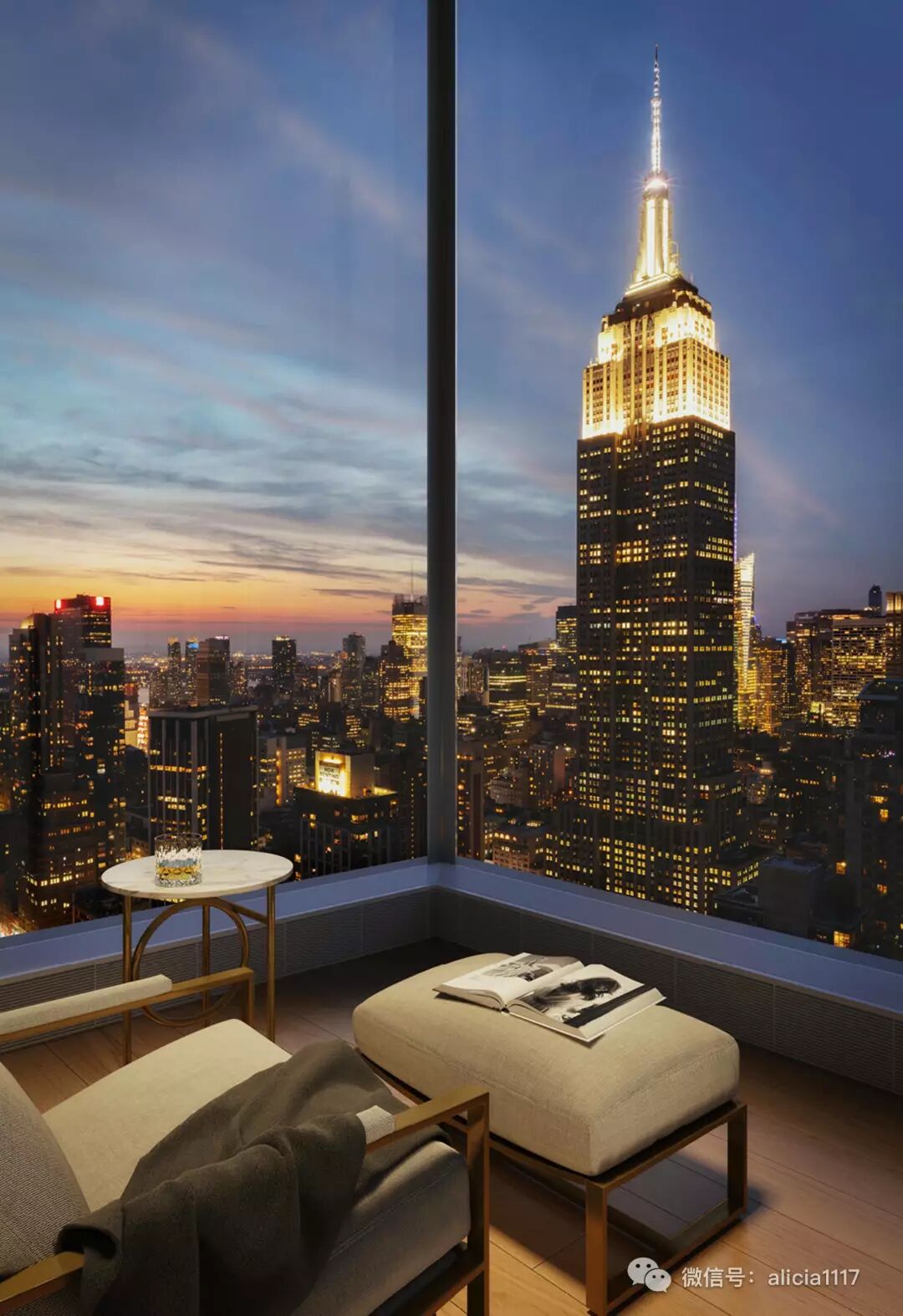 挑高楼层、转角落地窗,最大化空间带来的无敌宽阔视野,让你在家中优雅地欣赏闪闪发光的曼哈顿夜景和世界著名的帝国大厦灯光秀。