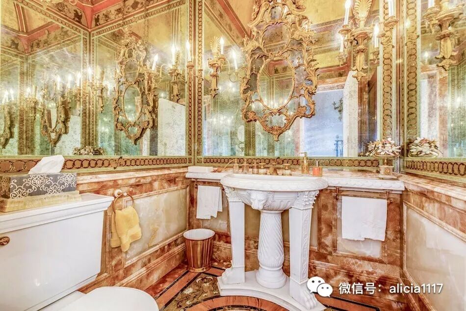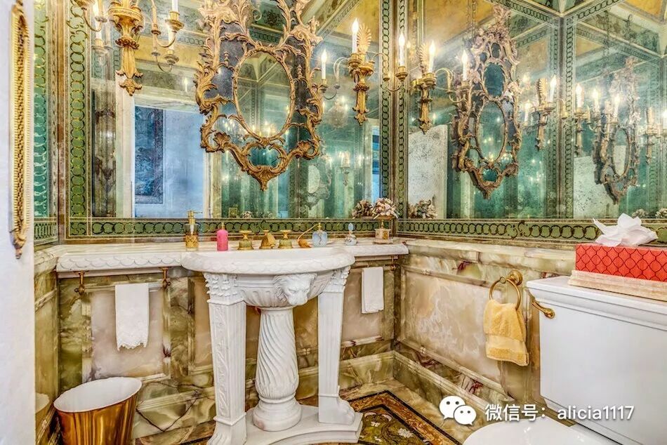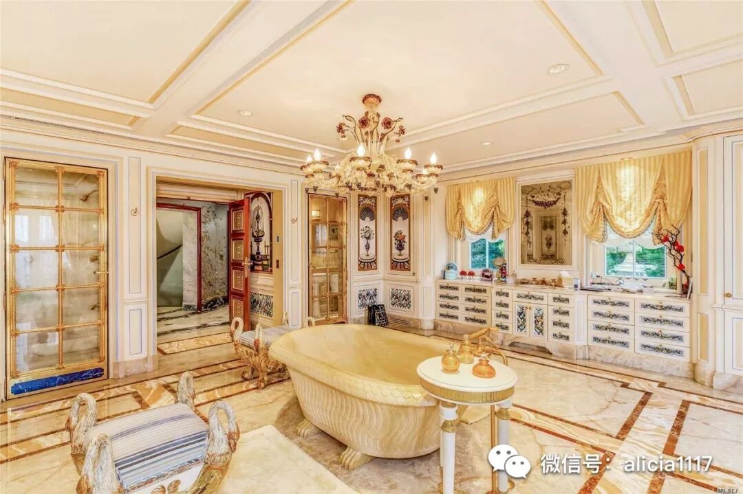 二层是女主人的主浴室,浴室配有整块石头雕刻而成的大理石浴缸和精致坚固金属装饰的超大蒸汽淋浴(这个设计后来给了巴黎布里斯托尔酒店的浴室装饰的灵感),以及PietraDura拼花大理石瓷砖墙,Verre Eglomise镀金玻璃镜子,和带有电梯的两层楼步入式衣帽间。