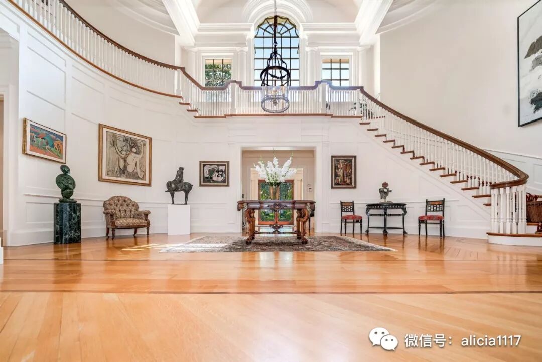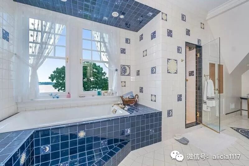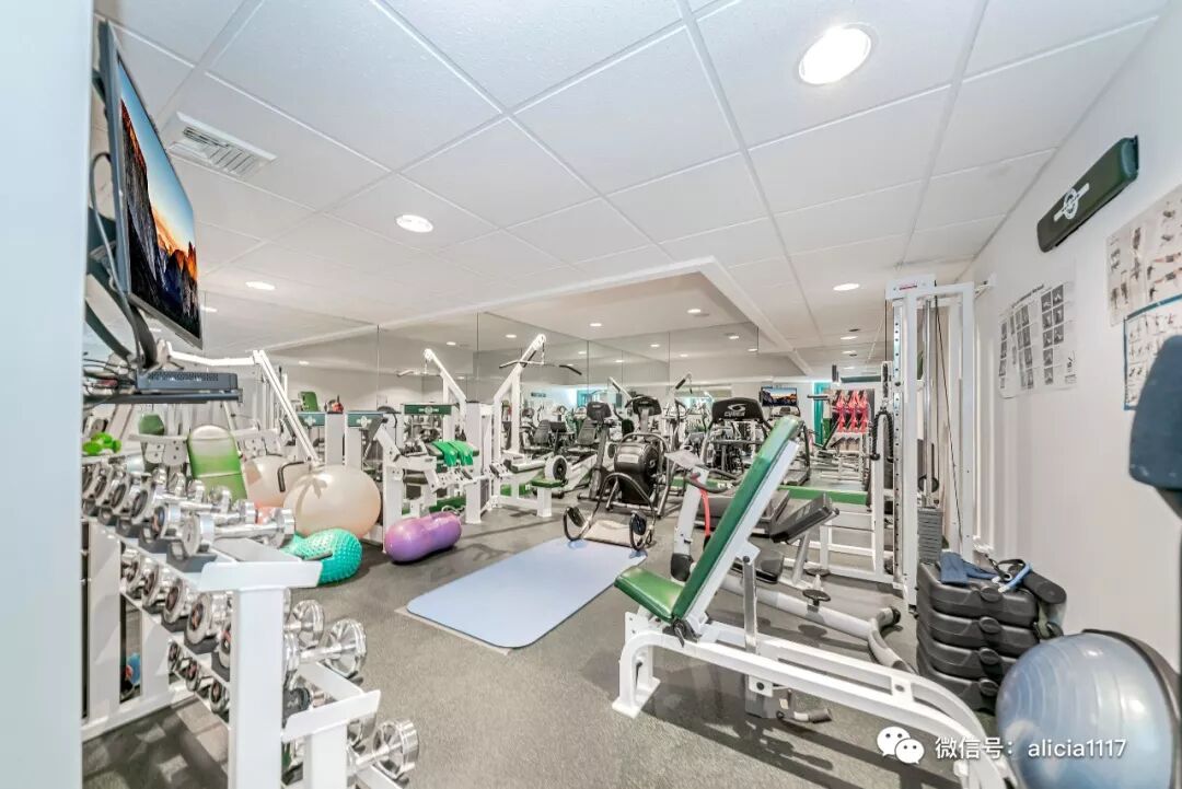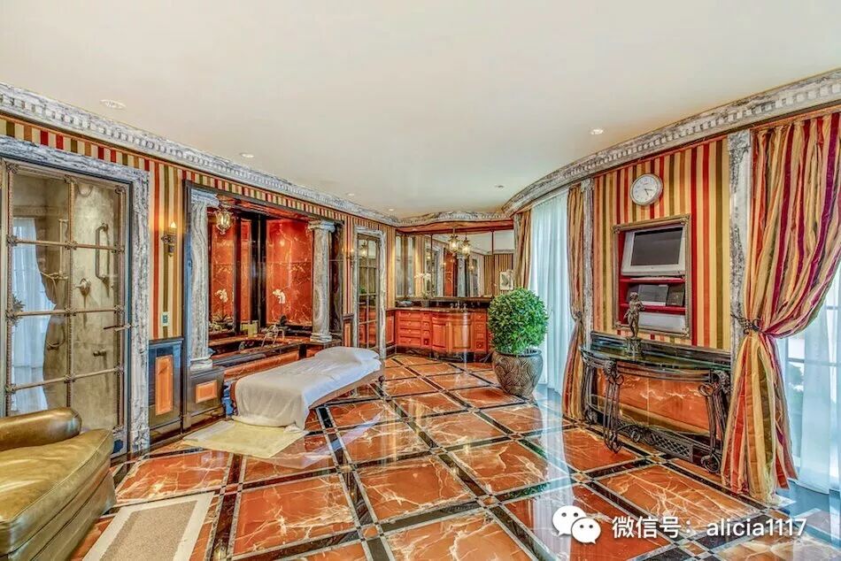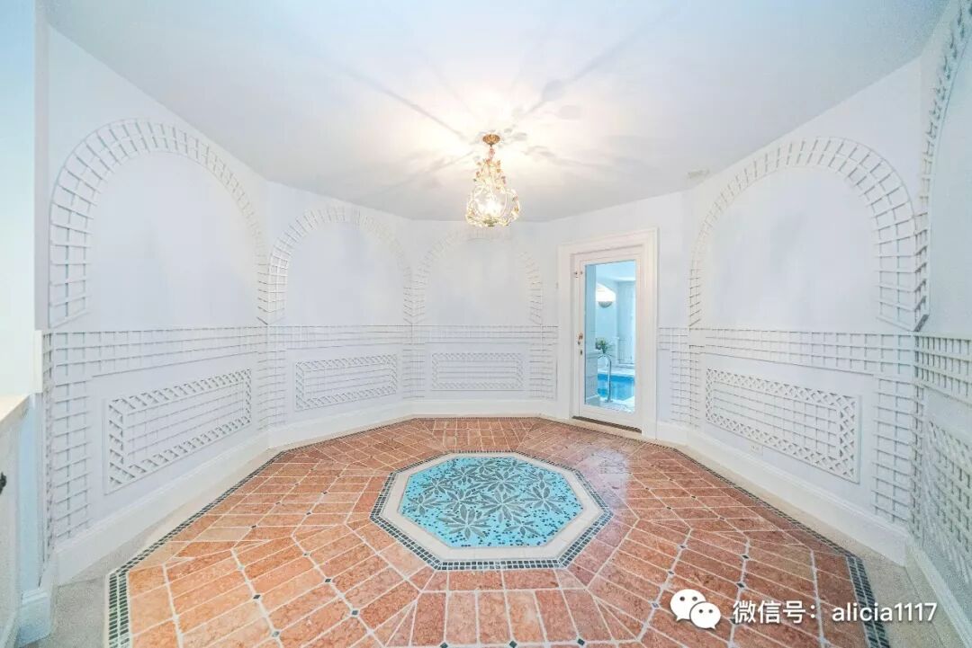 带马赛克大理石地砖的宽敞弧形落地窗健身房,全尺寸的配餐厨房,木质镶板的图书室等。