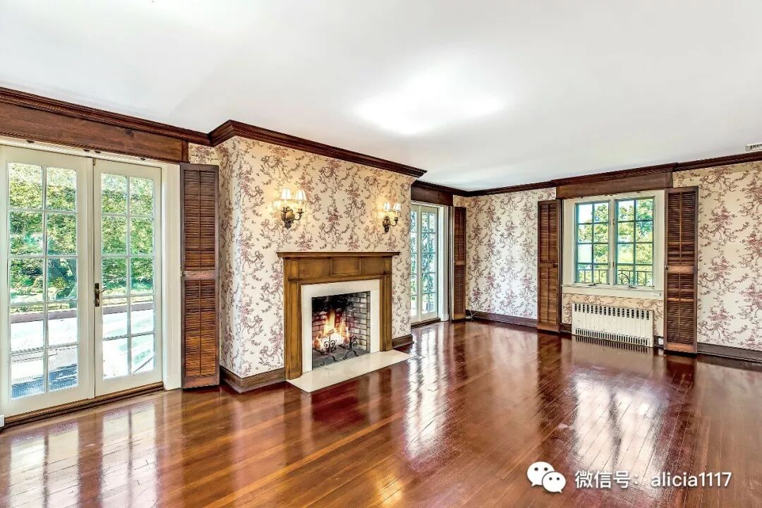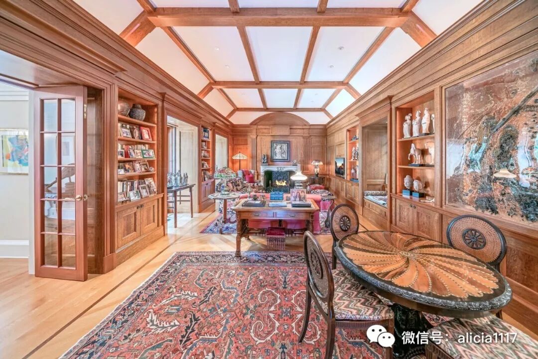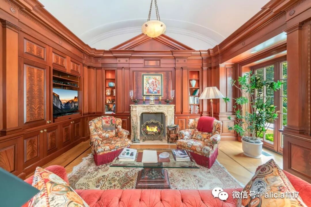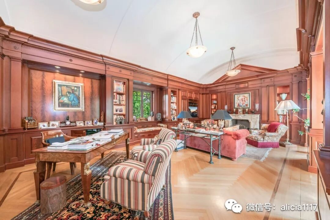 “她的”书房采用定制的的英国橡木镶板,而“他的”采用深色桃花心木。两者都带有古董壁炉,前者是18世纪的路易斯十六世风格石灰石材质,另一个则是19世纪的法国大理石。