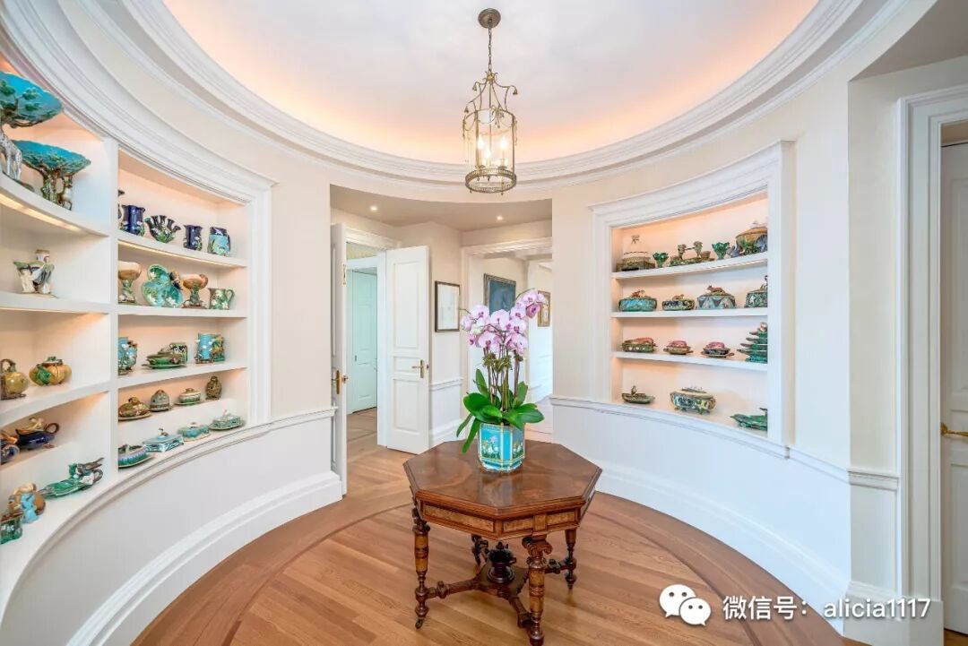 两侧有两个圆形的前厅,通过宽敞的展示柜和搁板创造了巧妙优雅的转换到起居卧室区。