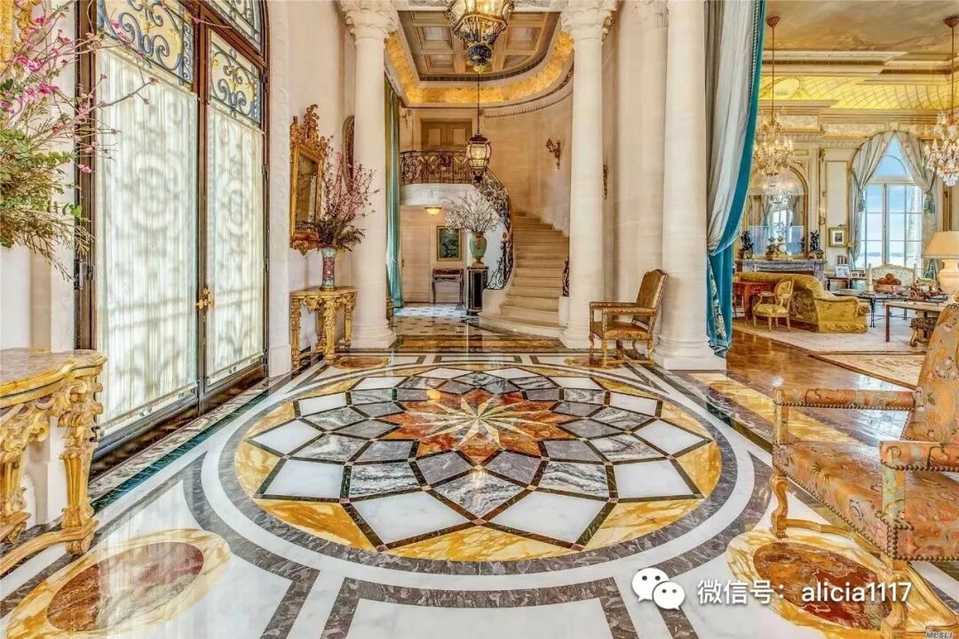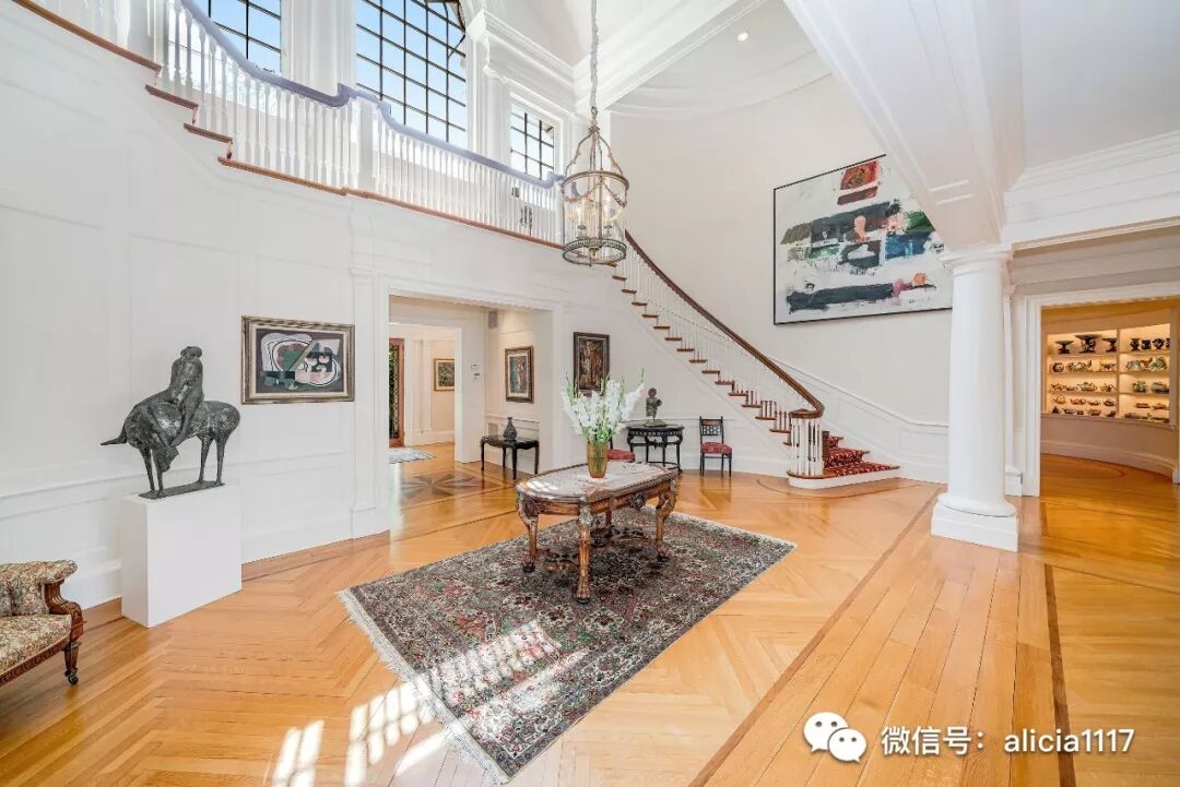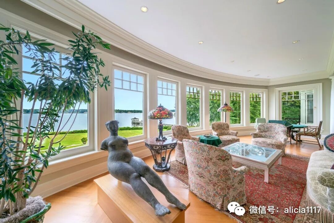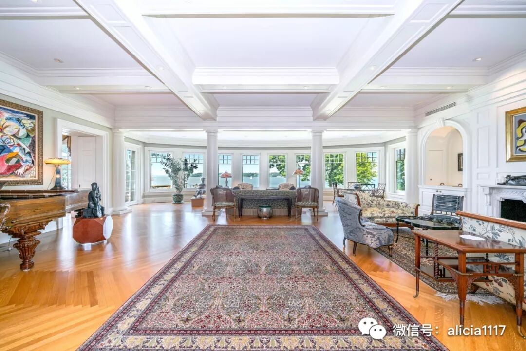带有高高的弧形窗户和罗盘玫瑰地板的大楼梯带你引入宽敞气派的会客区。其中一边的会客厅,包括设计内嵌的鸡尾酒区,大圆柱,格子天花板,以及弧面窗户为您带来的曼哈塞特湾(Manhasset)全景。