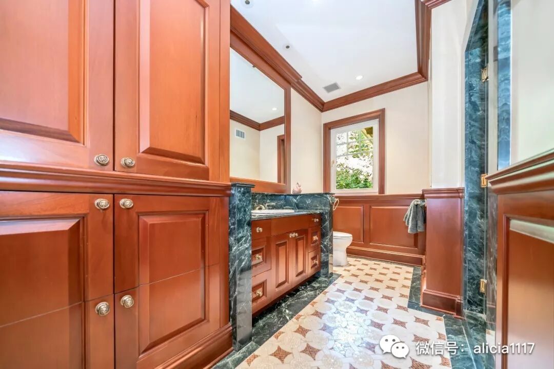 而男主人的浴室配有桃花心木橱柜和翠绿色大理石台面。