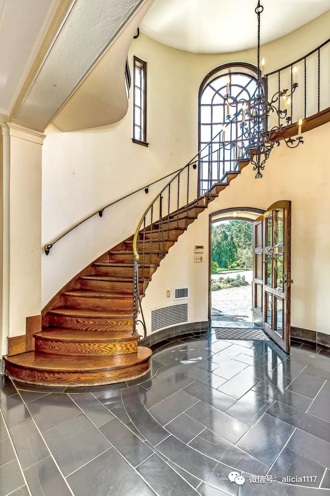 定制的前门,圆形门厅,弧形玻璃窗和铁枝形吊灯将在您进入家门时欢迎您。