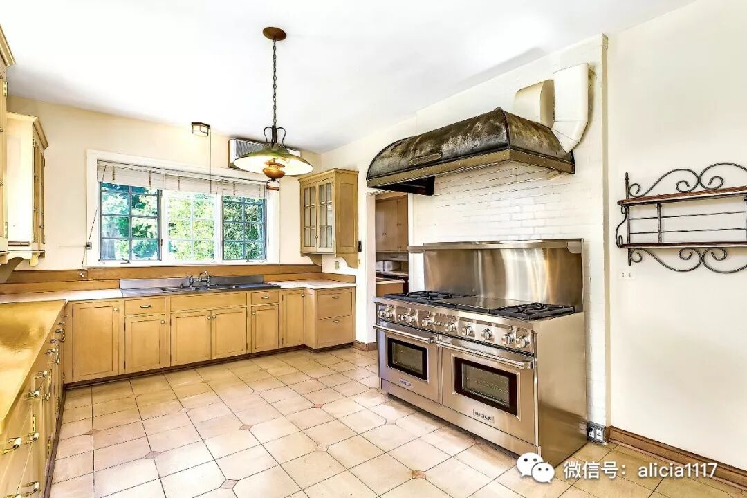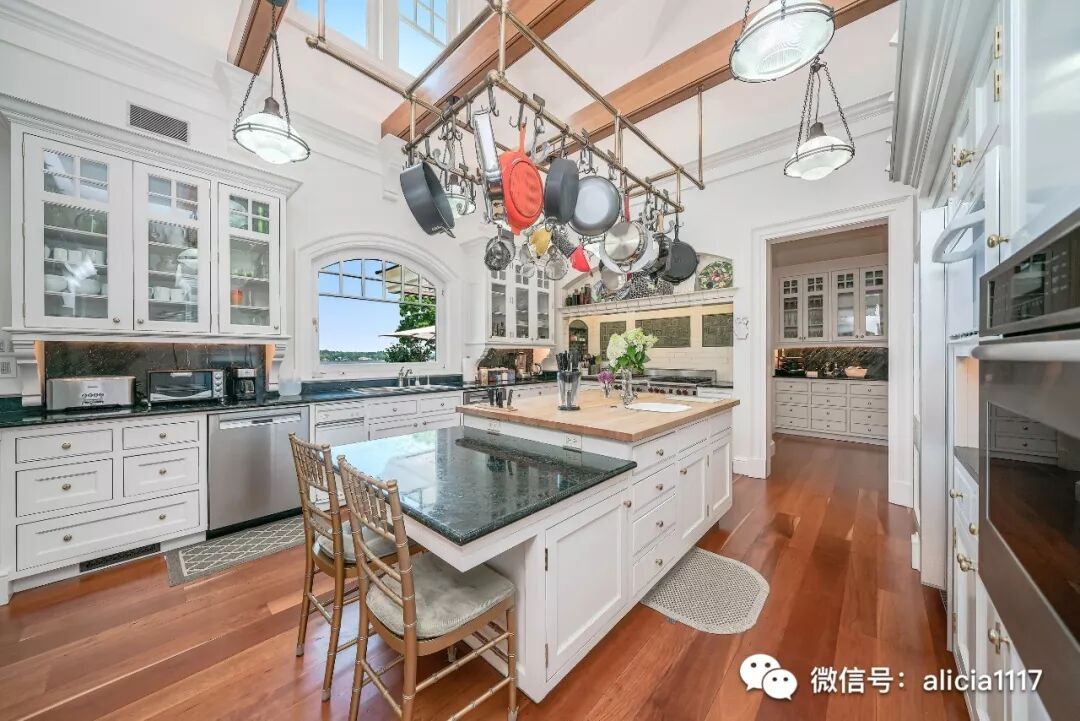 与餐厅相邻的是宽敞明亮的厨房,包括管家茶水间,定制橱柜,带吊锅架的两层中央岛和先进的电器设备。