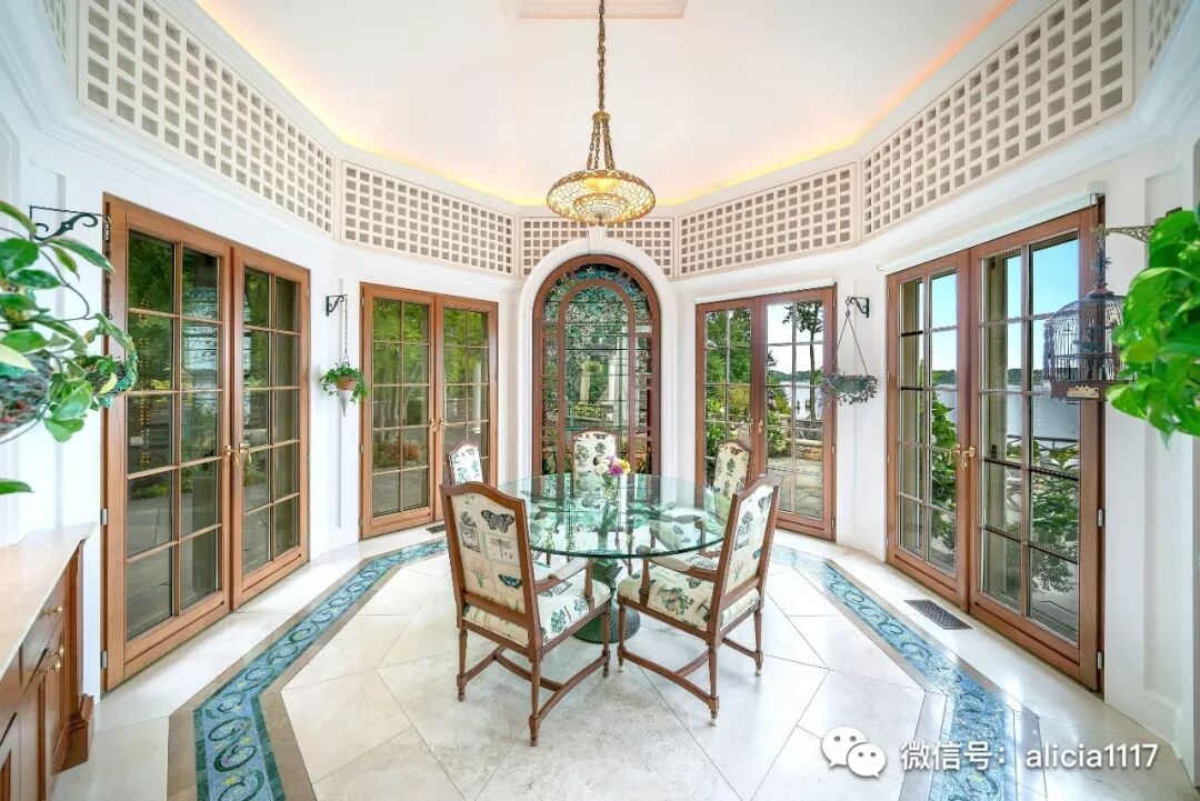 八角形的早餐厅被设计成一个“既室内又室外”的空间,拥有一个彩色大玻璃窗和五套法式门,使自然光线充满整个餐厅。